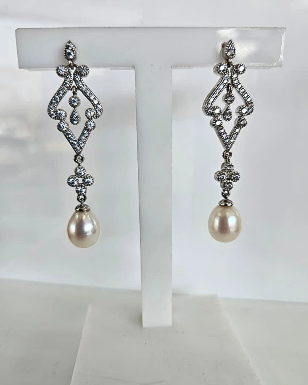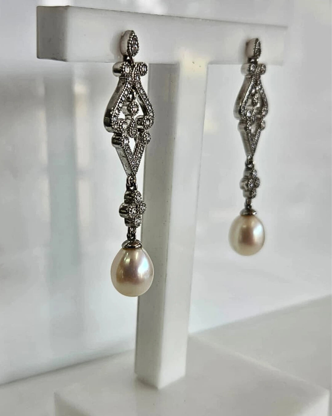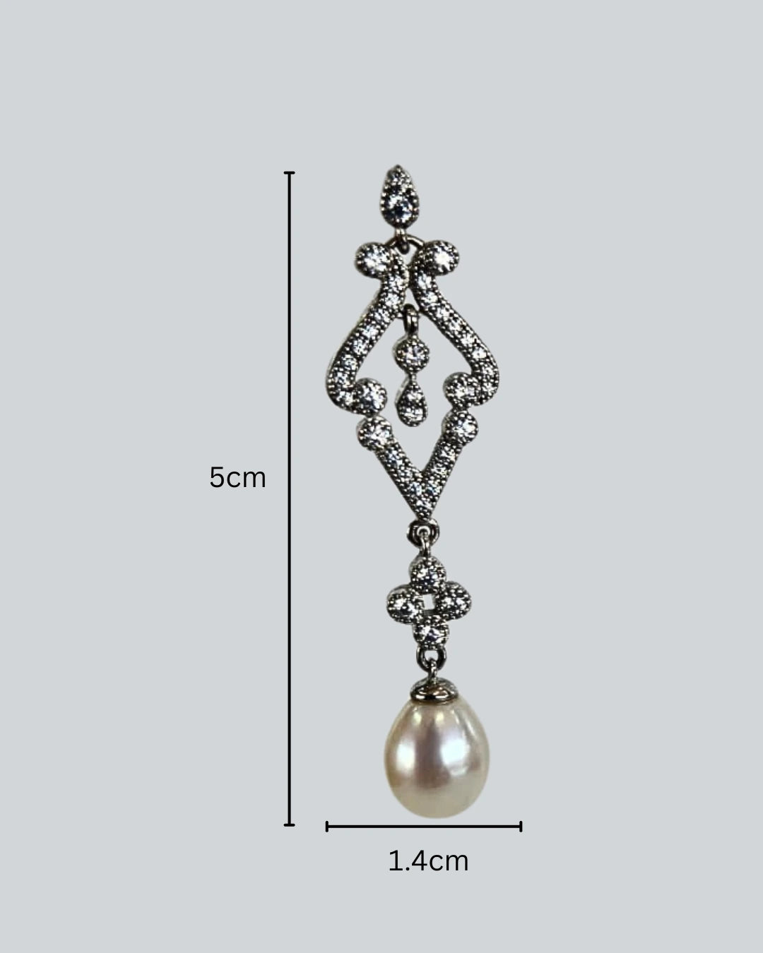 The Vivienne earrings embody timeless sophistication with a touch of antique romance. Intricately detailed with sparkling cubic zirconia, these 5cm x 1.4cm drops are gracefully finished with lustrous freshwater pearls. A statement of elegance, they’re the perfect finishing touch for any refined occasion.