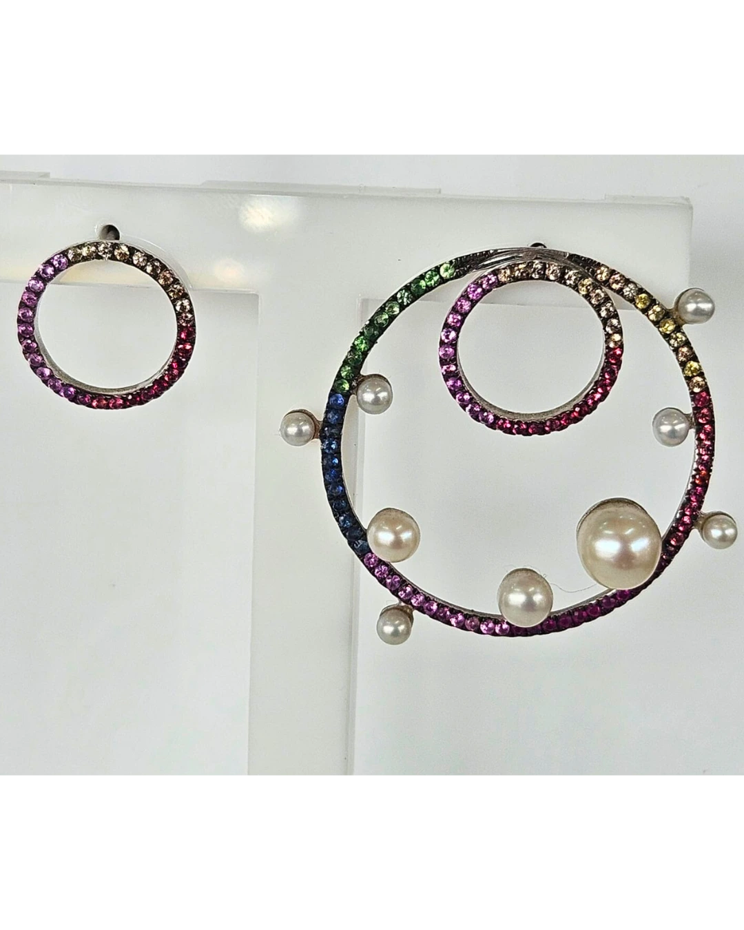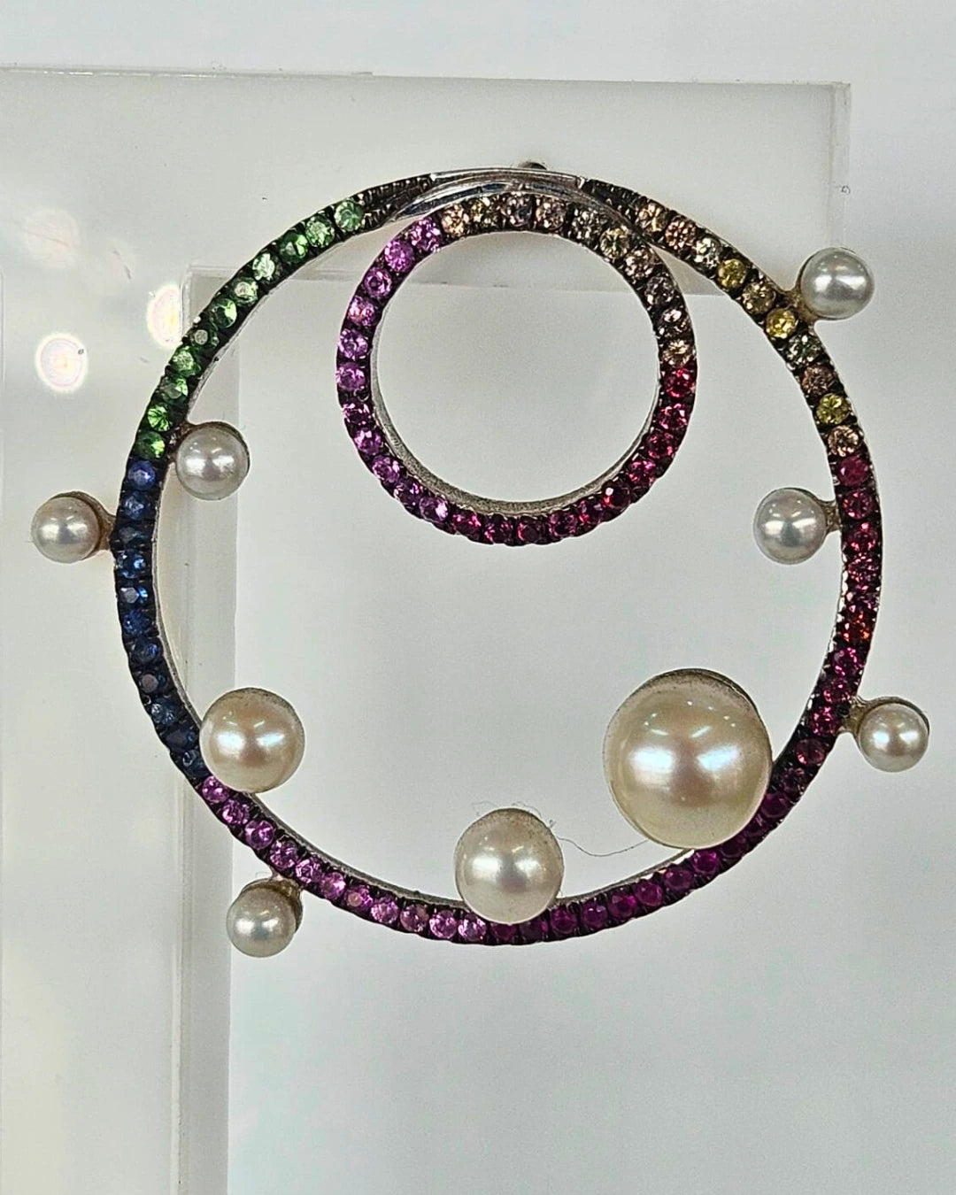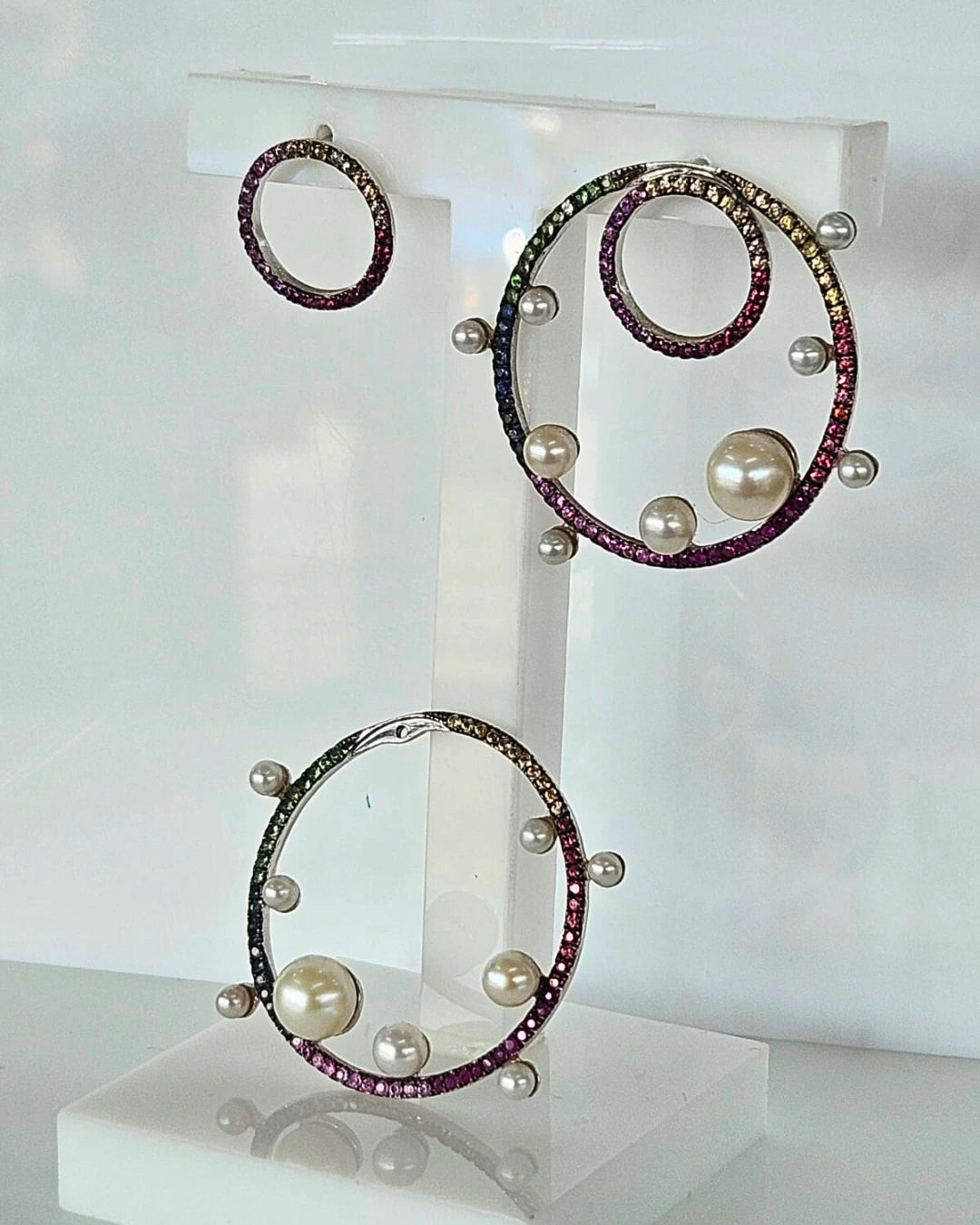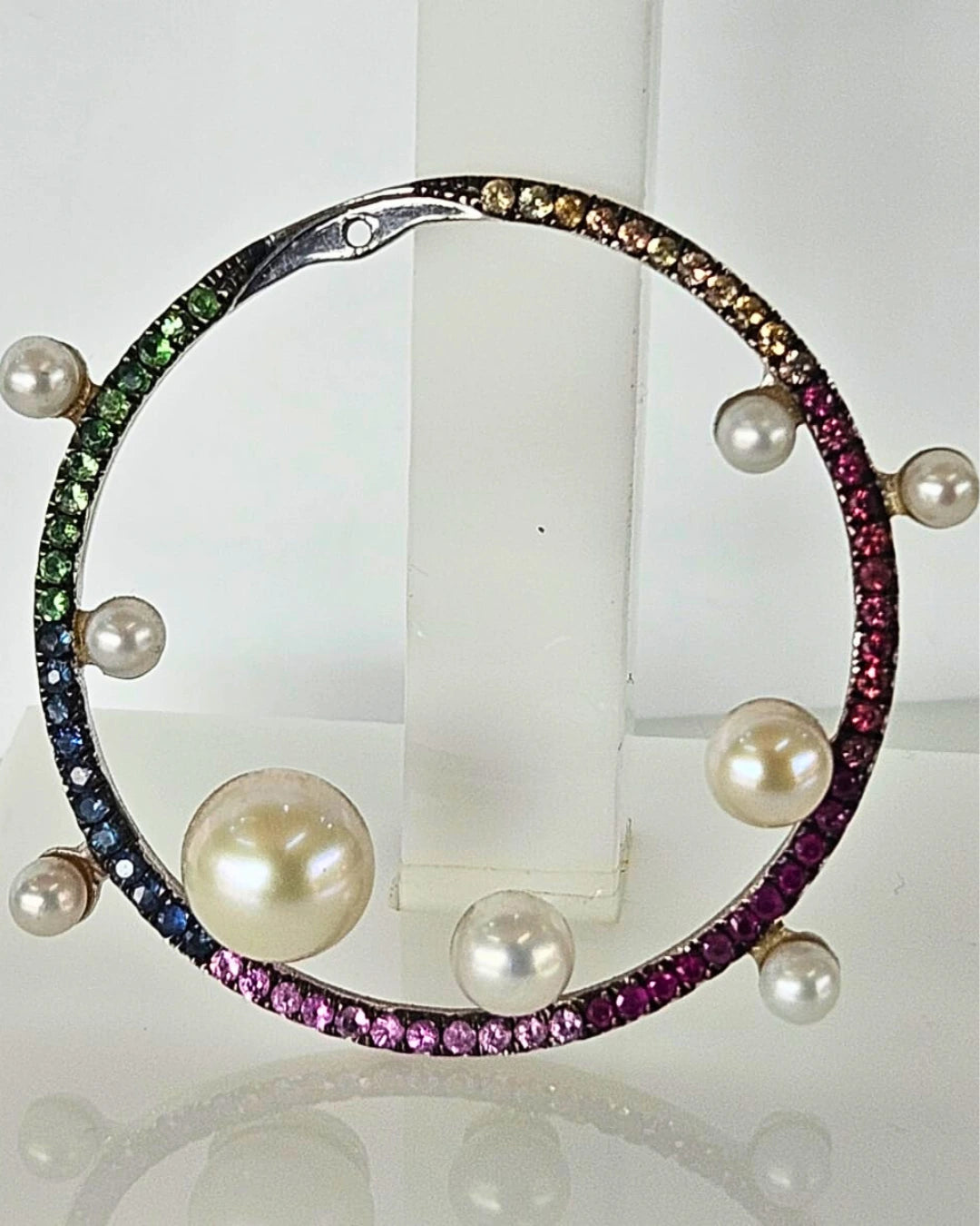 The Aurelia earrings bring playful versatility to timeless elegance. Set in sterling silver, they feature 2.5ct of rainbow sapphires encircling luminous pearls in a modern, celestial-inspired design. Uniquely crafted, these earrings can be worn in three ways — with the statement circle in front, at the back, or simply as classic studs. A radiant fusion of colour and sophistication, Aurelia is made to move effortlessly from day to night.