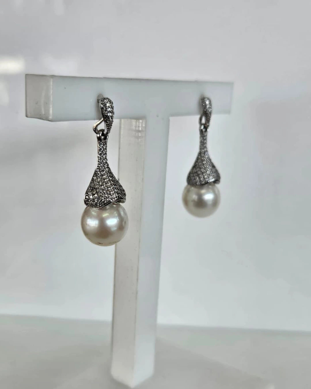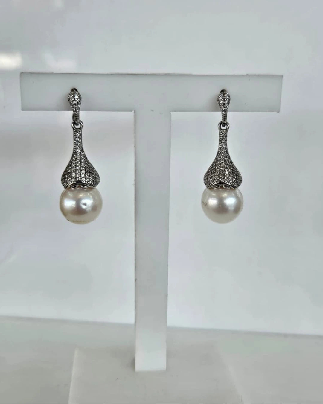 The Elise earring is all about refined sophistication. At 3.5cm long, it features a fully pavé-set silhouette that flows into a luminous 11mm freshwater pearl drop—balancing light-catching sparkle with graceful movement. Perfect for evening wear or a polished bridal finish, Elise brings classic glamour with a modern edge.
