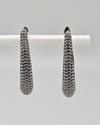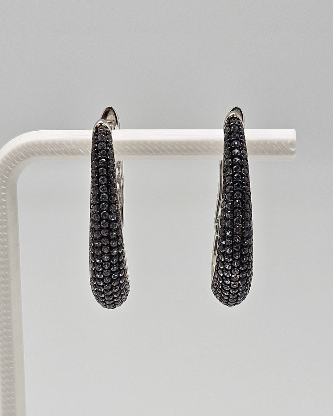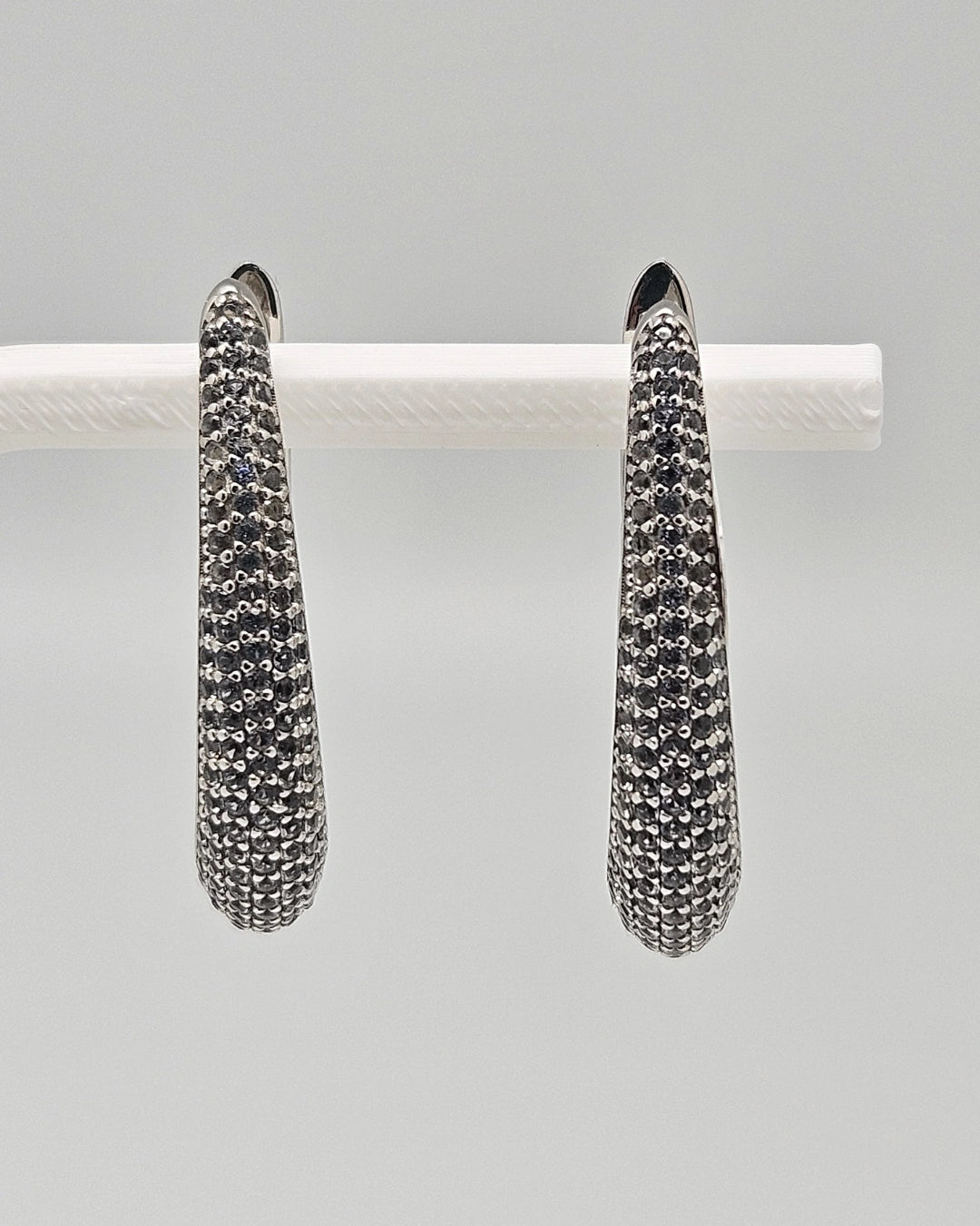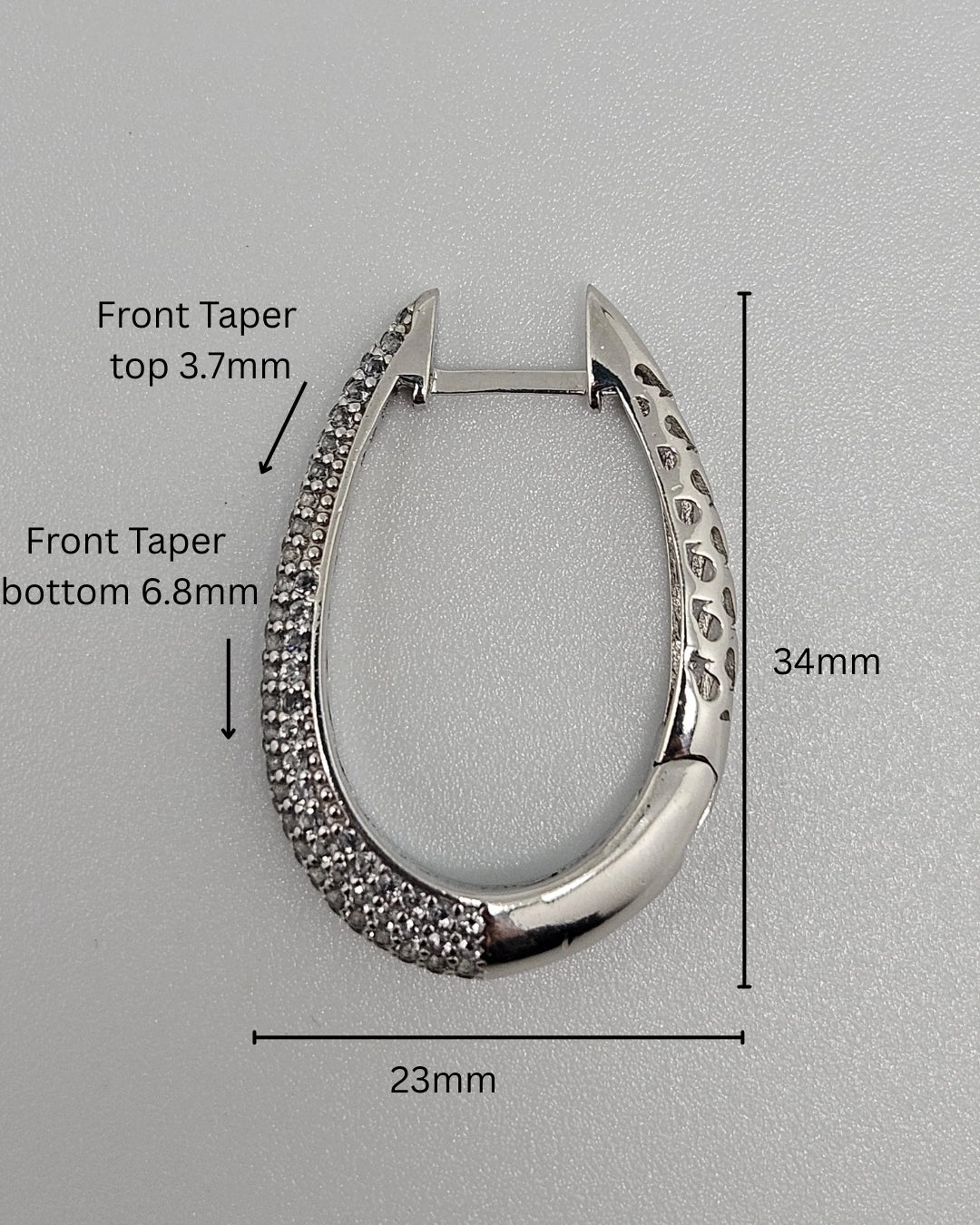 The Jolene Huggie is a statement in every sense—longer, wider, and made to be noticed. Measuring 34mm top to bottom with a striking 23mm width, its front face tapers from 3.7mm to a bold 6.8mm, fully paved with shimmering cubic zirconias. The back? Just as stylish, with an intricate patterned design that adds depth and detail.