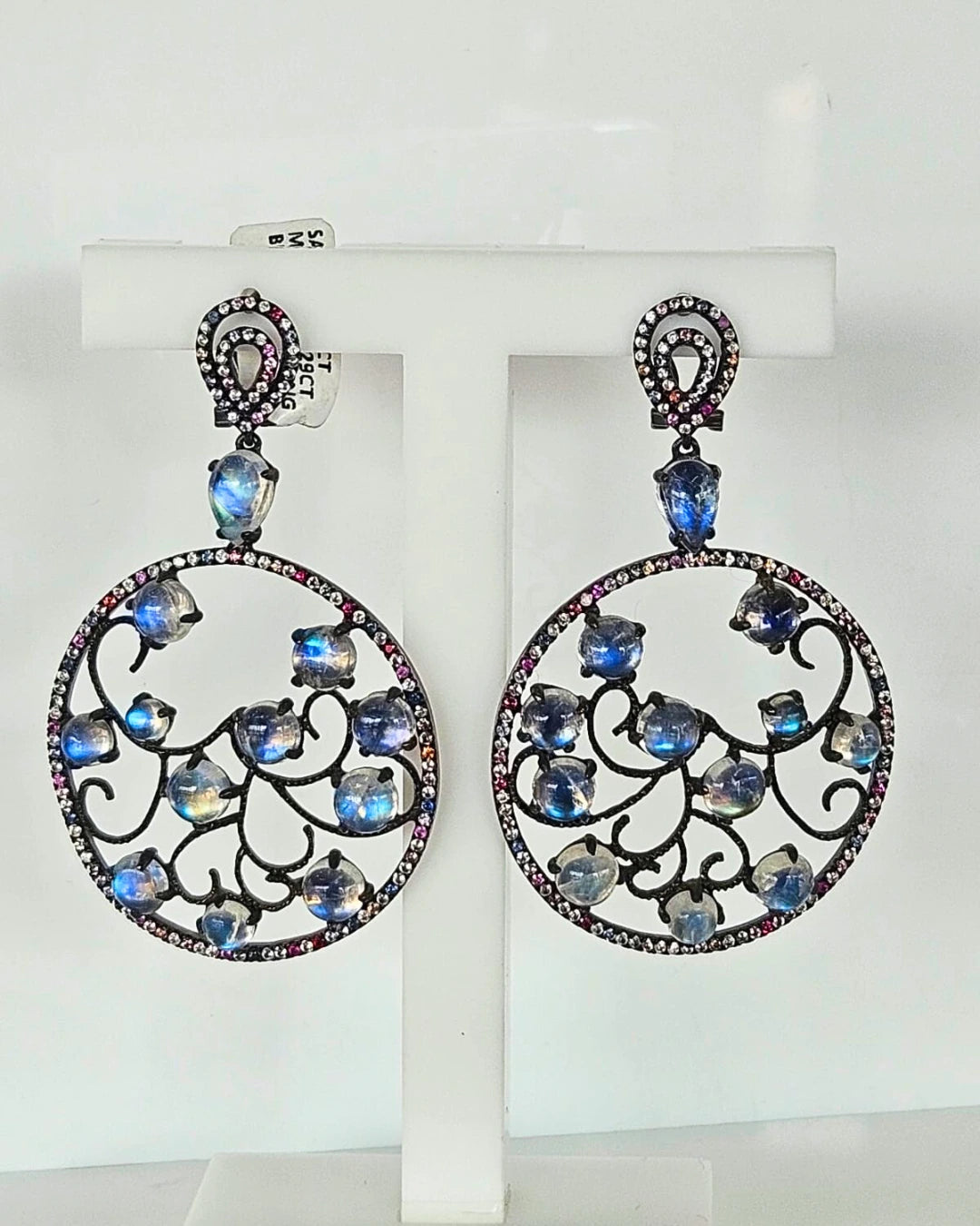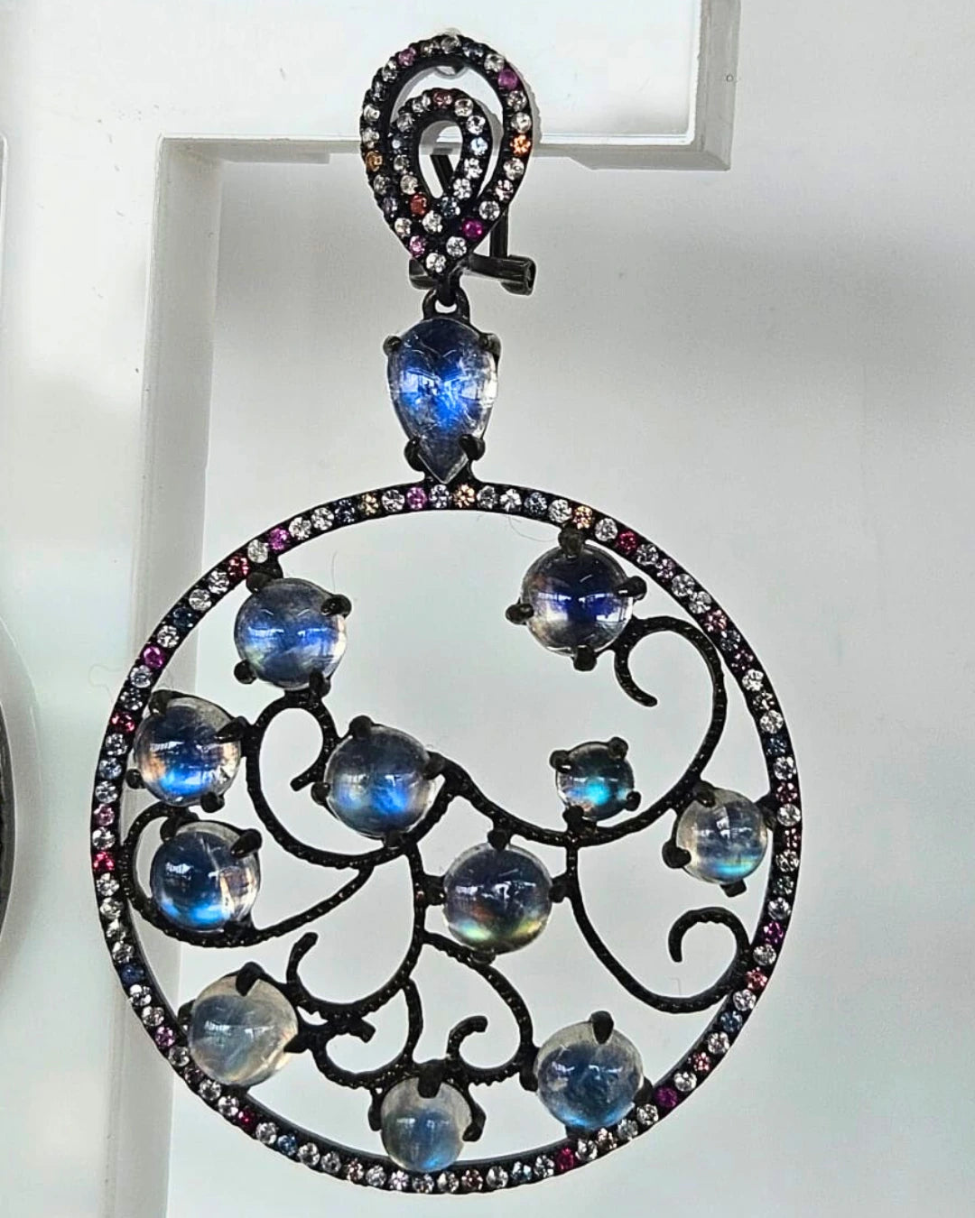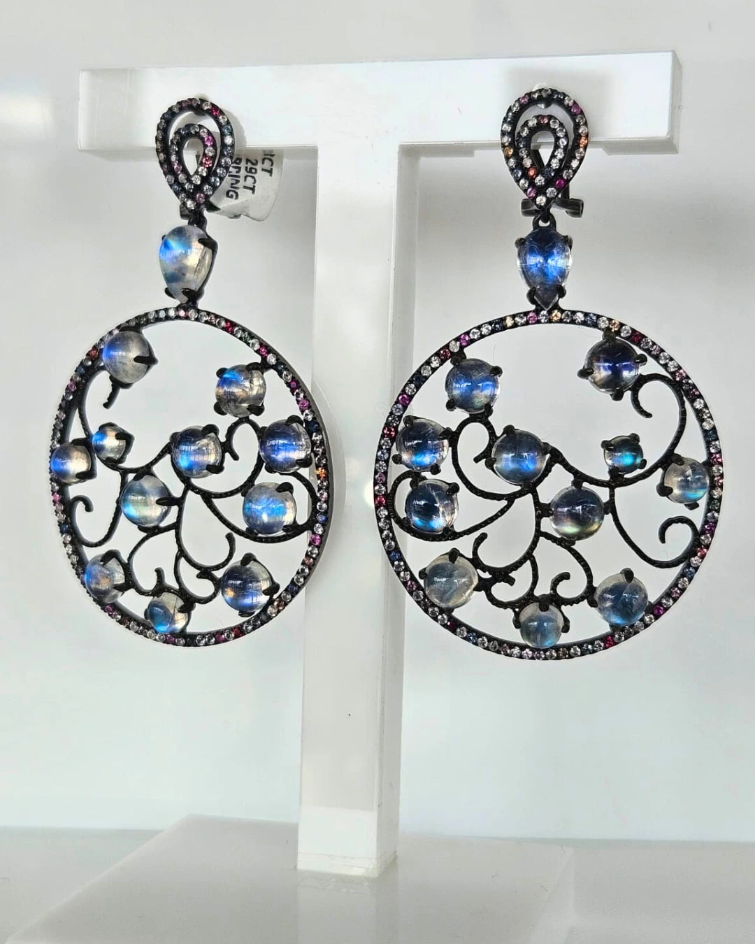 The Selene earrings are a striking ode to celestial beauty, crafted in sterling silver with black rhodium plating to intensify their glow. A constellation of 29ct moonstones shimmer with ethereal light, accented by 1.3ct of rainbow sapphires that bring a vivid burst of colour. Bold and enchanting, Selene is a true statement piece — where artistry meets the magic of the night sky.
